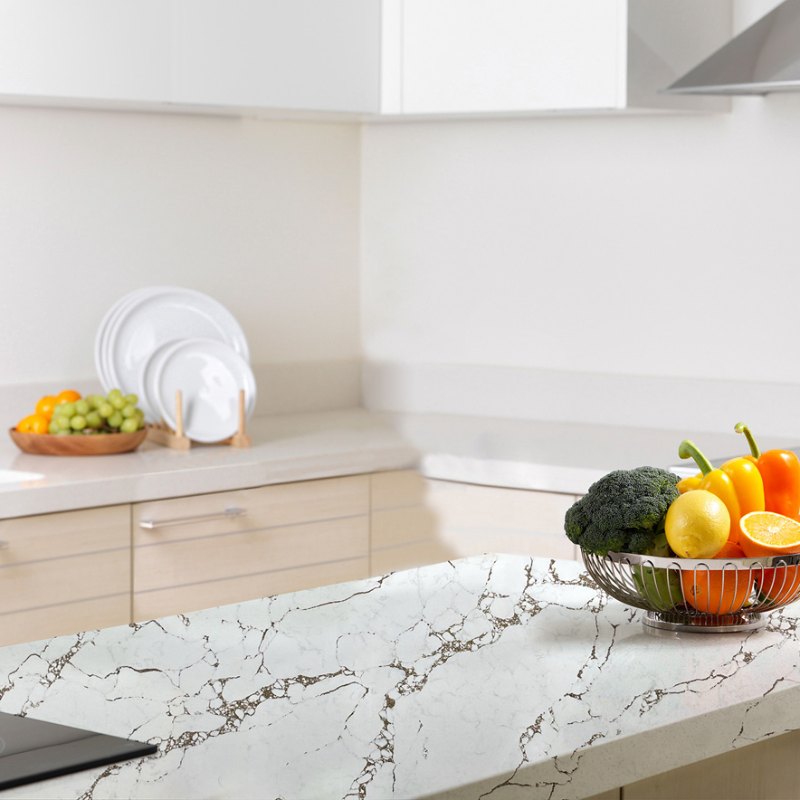 Calacatta Gold is a solid surface containing 93% quartz materials (SiO2) bound with adhesive with the characteristics of resistant to scratch, stains, and chemicals. It is a pure white base with golden veins and lines spreading through the full body of slabs, which is the most popular quartz color recently. It is the most suitable for making big-size countertops and benchtops. Both polished and honed surfaces are available.