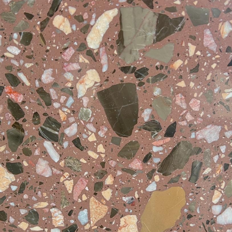 Gold Lotus Terrazzo is made of marble, granite, quartz, glass, ceramic, and some other suitable materials bound together with a cementitious binder and polymer to create prefabricated slabs and tiles. Gold Lotus is a red base with colorful chips spreading the full slab. Terrazzo, with the characteristics of impenetrable to moisture and durability and a wide choice of patterns available, is the perfect material for flooring, walling, and stairs as an alternative to marble or granite. It helps to upgrade your precious kitchen and bathroom spaces.