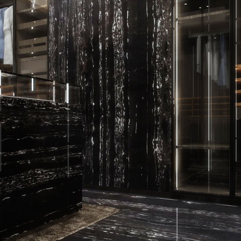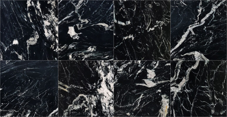 Black Marquina Engineered Marble is a composite material made of crushed stone materials bound together with an adhesive and pigment to create a solid surface, with the characteristics of a marble look, seamless joint, high ROI, and easy maintenance. Black Marquina is a black base with white veins spreading through the full slab, imitating Marquina marble textures. Engineered marble is the most optimal choice for vanity tops, window sills, and commercial flooring as an alternative to laminate or granite.