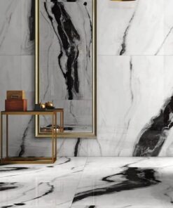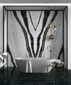 The sintered stone is a composite material made of engineered quartz, feldspar, silica sand, and mica powder which are molded by a pressing machine with more than 10,000-ton pressure and fired in a roller kiln with over 1,200℃ temperature to create a vitrified surface, with the characteristics of a natural marble look, resistant to scratches and stains, and free of radiation and formaldehyde. Sintered stones have less thickness than natural marble, therefore, it is the most optimal decoration material for the big-scaled wall veneer in commercial spaces or residential spaces. LV1632LS036 Panda White imitates the real Panda White marble, which is the most optimal selection for your big-scaled floor and wall decorations.