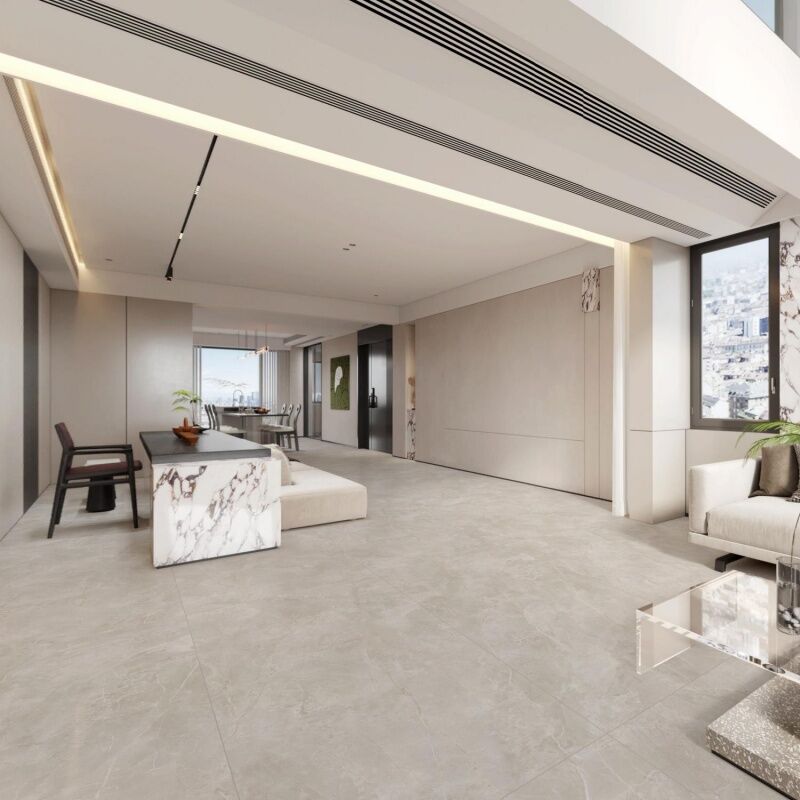 The sintered stone is a composite material made of engineered quartz, feldspar, silica sand, and mica powder which are molded by a pressing machine with more than 10,000-ton pressure and fired in a roller kiln with over 1,200℃ temperature to create a vitrified surface, with the characteristics of a natural marble look, resistant to scratches and stains, and free of radiation and formaldehyde. Sintered stones have less thickness than natural marble, therefore, it is the most optimal decoration material for the big-scaled wall veneer in commercial spaces or residential spaces. , which is the most optimal selection for your big-scaled floor and wall decorations. Both polished and matt surfaces are available.