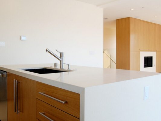 Pure White is a solid surface containing 93% quartz materials (SiO2) bound with adhesive with the characteristics of being resistant to scratches, stains, and chemicals. Its white quartz purity is optimal for kitchen countertops, island tops, and bench tops because the white color can match different kinds of decoration styles. Both polished and honed surfaces are available.