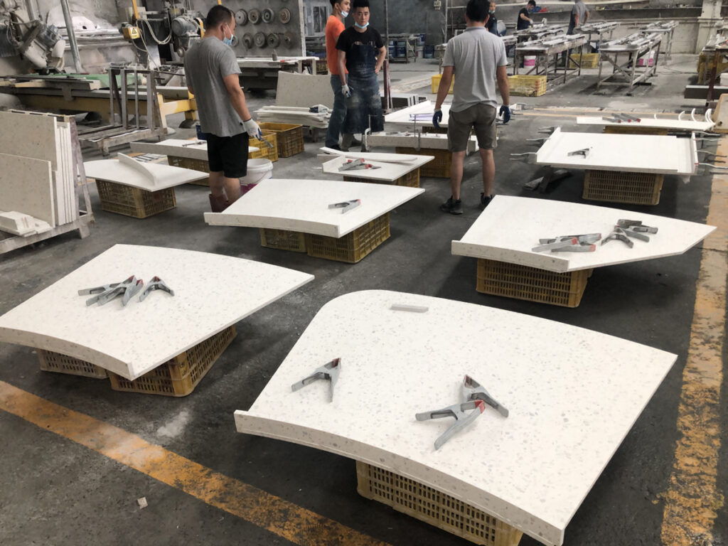 Com a ajuda de várias instalações de processamento avançadas, podemos fazer todos os formatos de produtos de pedra, incluindo, mas não se limitando a bancadas, mesas, folheados finos, mármores laminados, pavimentadoras, colunas, peitoris, etc. Devido à nossa equipe qualificada, podemos pré-fabricar todos os tipos de tampos de quartzo para cozinha e banheiro com perfis de borda sem costura, acabamento de alto brilho e tolerância mínima de tamanho. No espírito da natureza, nossa equipe de P&D sempre desenvolve bons conceitos de design que ajudam nossos clientes a obter o que desejam. Além disso, temos uma equipe profissional para cumprir todos os seus designs para atingir os melhores resultados de aplicação.
